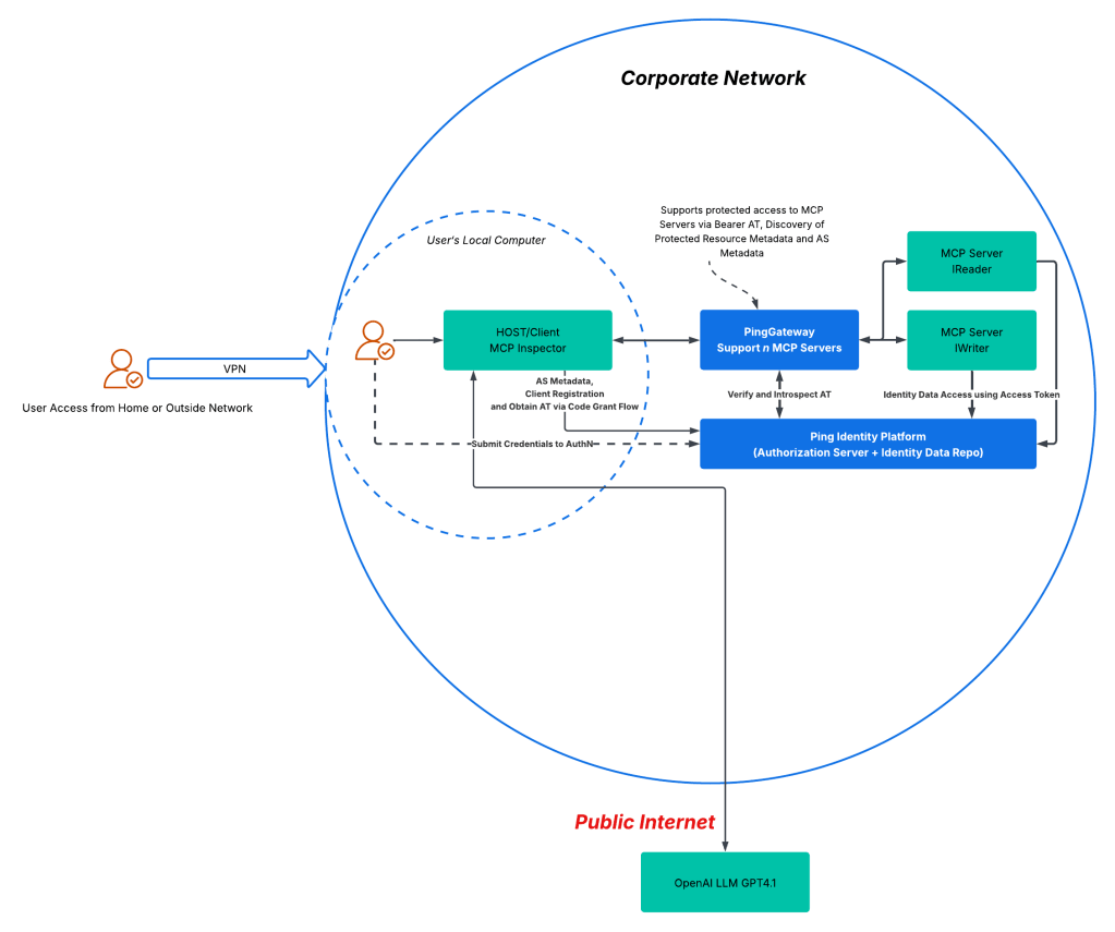 - PingPlatform – PingPlatform plays a dual role in the architecture. It acts as the Authorization Server (AS), delivering OAuth2 functionality to enforce the MCP authorization specification, and simultaneously serves as a data platform, hosting identity data that MCP servers make accessible to Hosts/Clients.