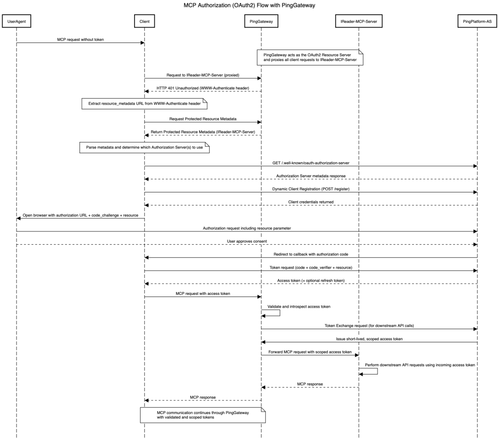 This demo highlights three use cases, leveraging two distinct MCP servers that are secured by PingGateway, which enforces the MCP Authorization specification and performs dynamic client registration as illustrated in the sequence diagram above: