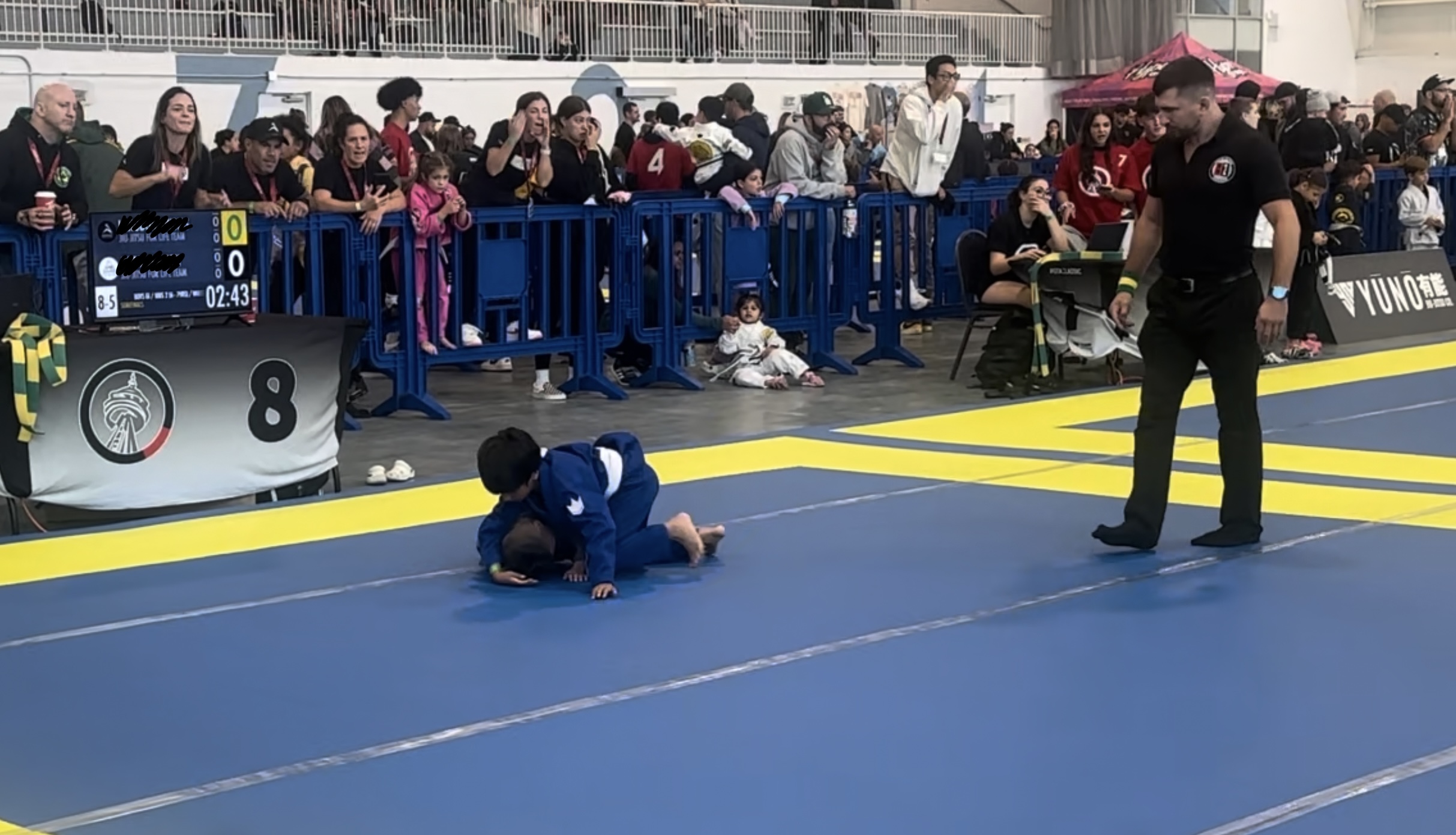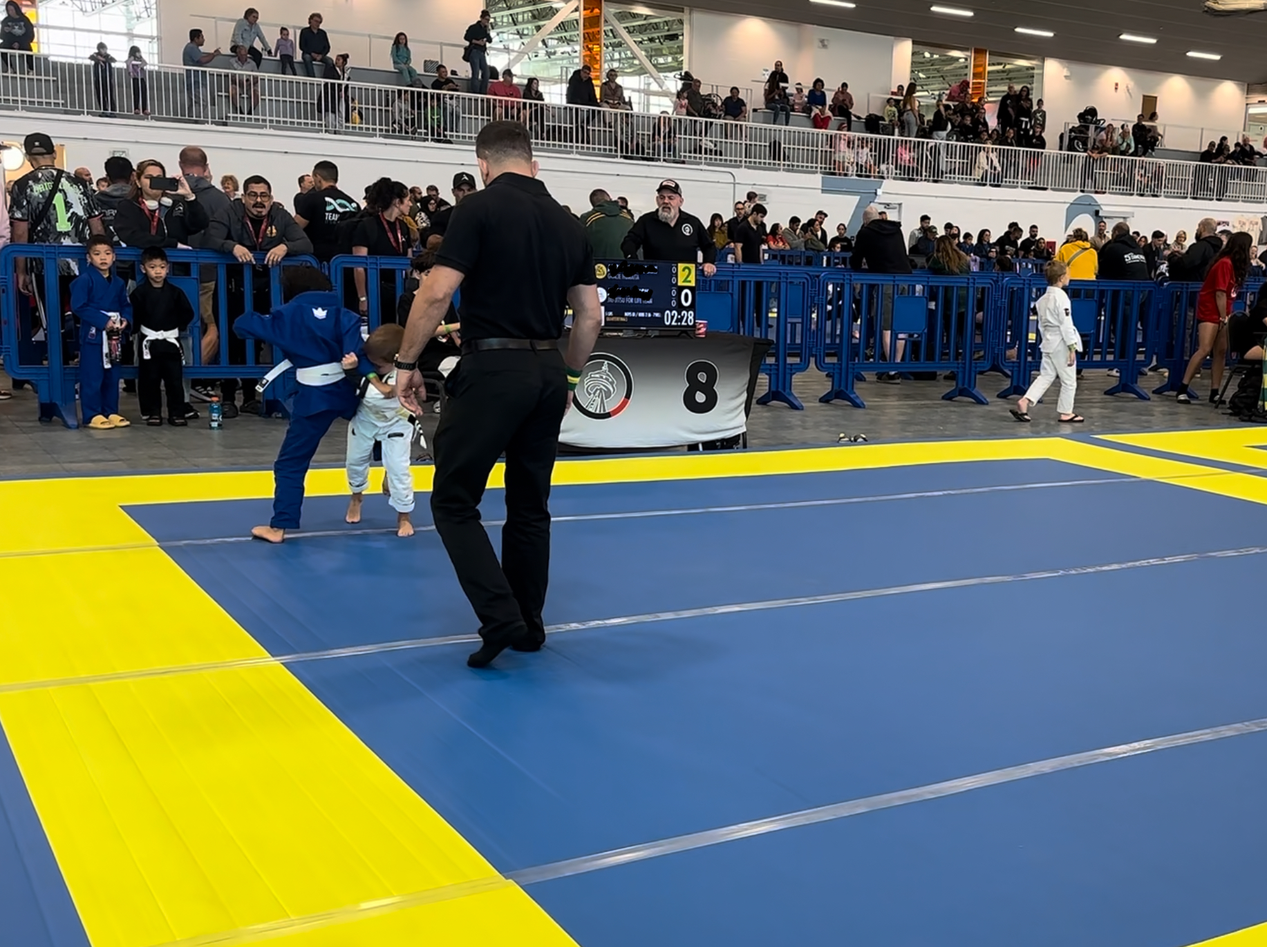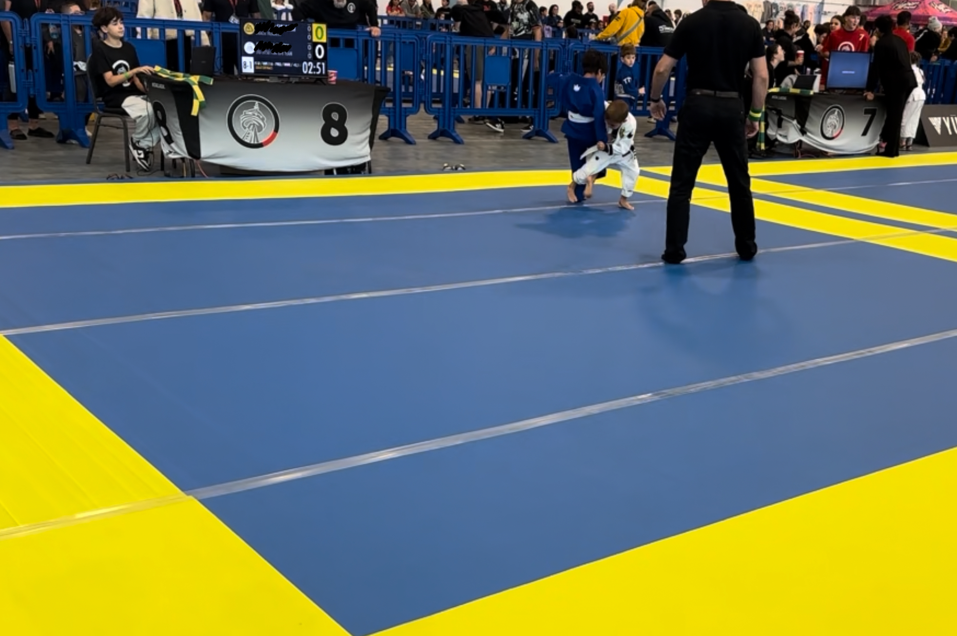 The mats were set up with plastic barricades around them. Parents and spectators stood on the outside, while coaches stayed on the inside. His coach, Ricky, was right there by the mats, ready to guide him with instructions.