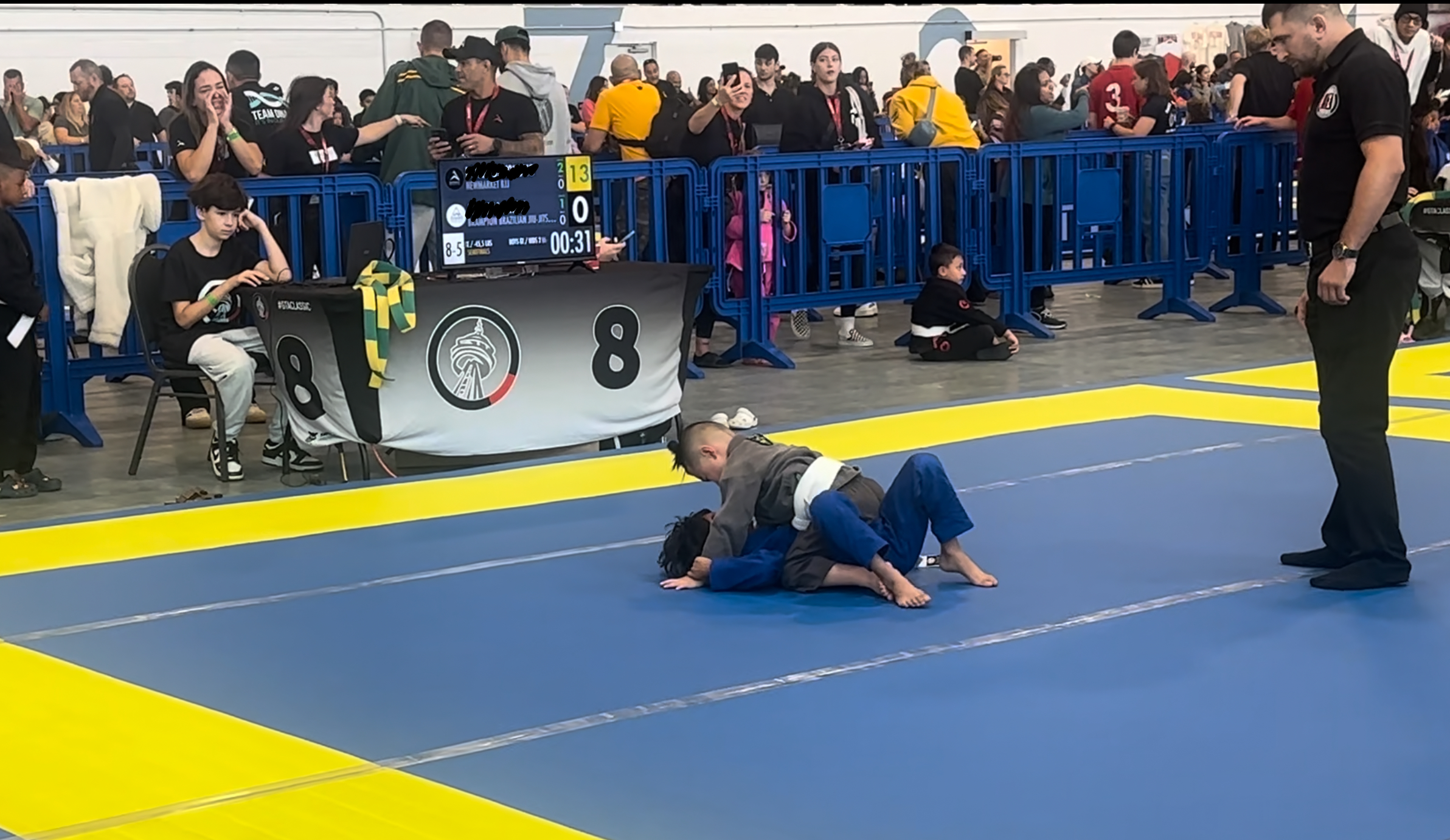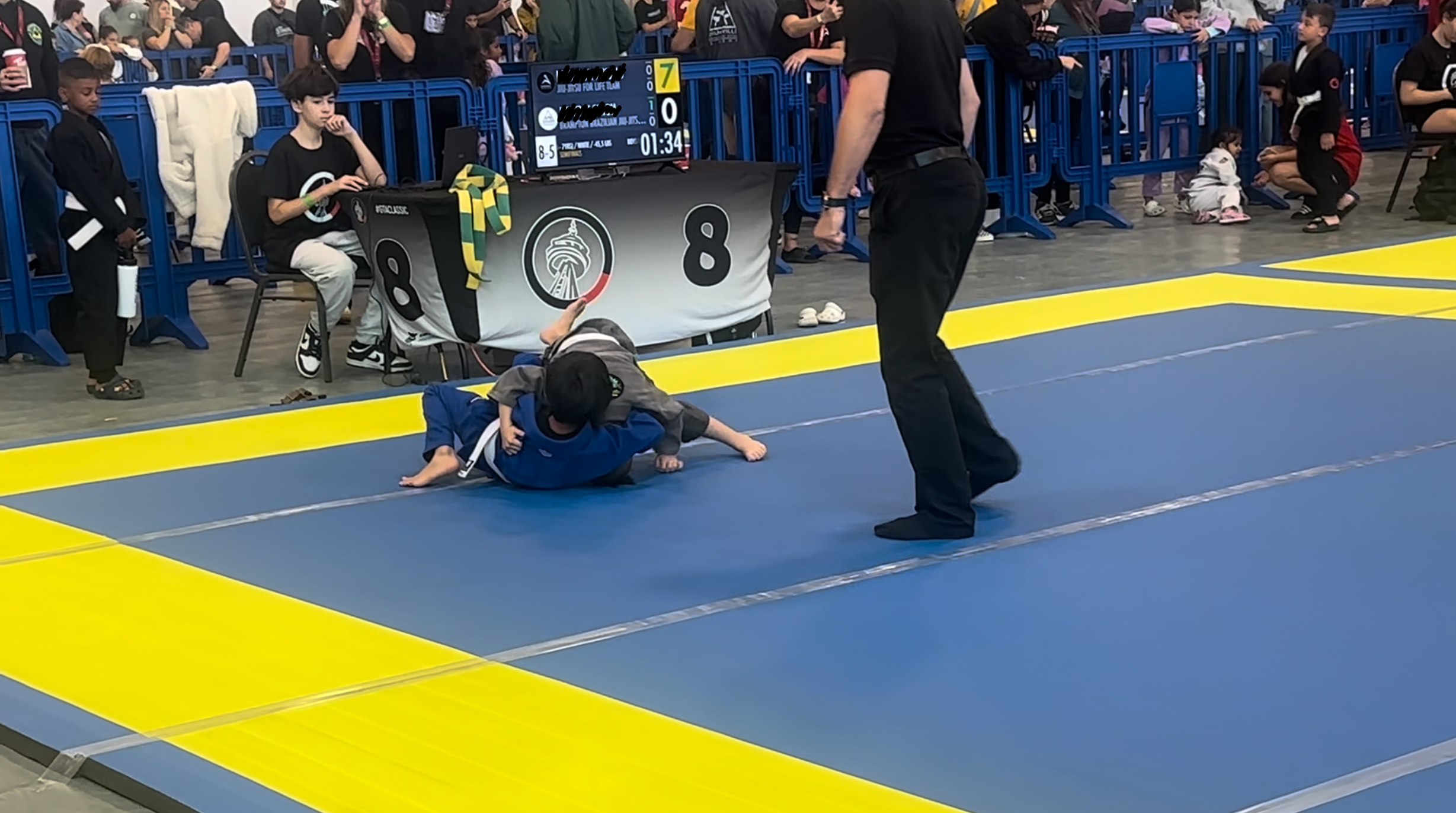Then came the turning point. They went out of bounds, and the referee reset them in the center. He started on top. I called out loudly for him to pass the guard and go for mount. His coach was doing the same, though it was hard to hear with the noise of eight other matches happening at once. Whether he heard us or just trusted his instincts, he knew exactly what needed to be done. With 30 seconds left, he passed guard, locked in side control, and transitioned to mount—earning the 7 points to tie the match.