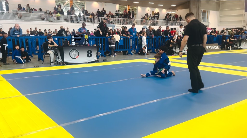 Fresh off his first win, J came out strong and immediately shot for a single-leg takedown. His opponent defended well and didn’t give up much ground. From the sidelines, it looked like the other kid was just waiting for J to make a mistake—and that’s exactly what happened. J eventually took the takedown, but his opponent countered right away with a sweep, moved into side control, and then climbed to mount.